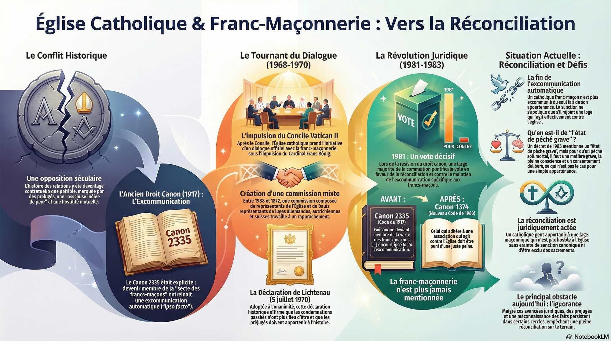 La réconciliation juridique entre l'Église catholique et la franc-maçonnerie "régulière" est un fait accompli depuis 1983. Le droit canon ne mentionne plus la franc-maçonnerie, et l'excommunication automatique a été abolie. Un catholique membre d'une loge qui n'est pas hostile à l'Église n'est donc ni excommunié, ni en état de péché grave du simple fait de son appartenance.