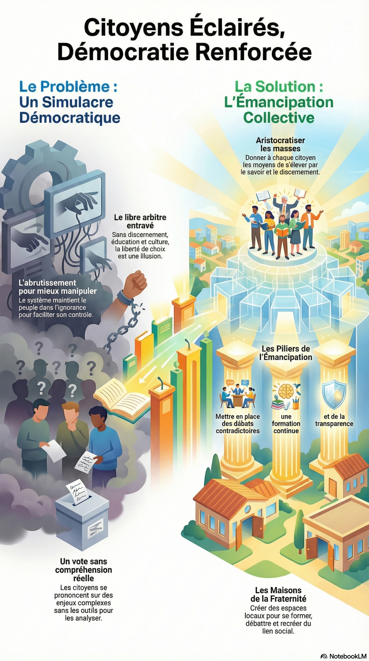 - Formation de Citoyens Éclairés : Le développement à grande échelle d'une citoyenneté active, capable de comprendre les enjeux complexes, de déconstruire les discours manipulateurs et d'exercer un jugement critique et indépendant.