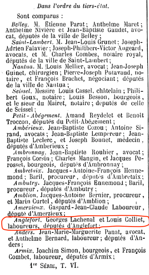 Georges Lachenal est mon aïeul. Les documents de l’époque le mentionnent comme député d’Anglefort lors des assemblées préparatoires aux États généraux de 1789. Le mot doit être entendu dans son sens exact : il était le représentant mandaté par sa communauté pour porter la voix du village dans les assemblées du bailliage. Dans les archives relatives aux comparants du Bugey, on trouve en effet la mention de « Georges Lachenal et Louis Golliet, laboureurs, députés d’Anglefort ». Cette simple ligne suffit à replacer cet homme dans le grand mouvement politique qui traverse alors le royaume.