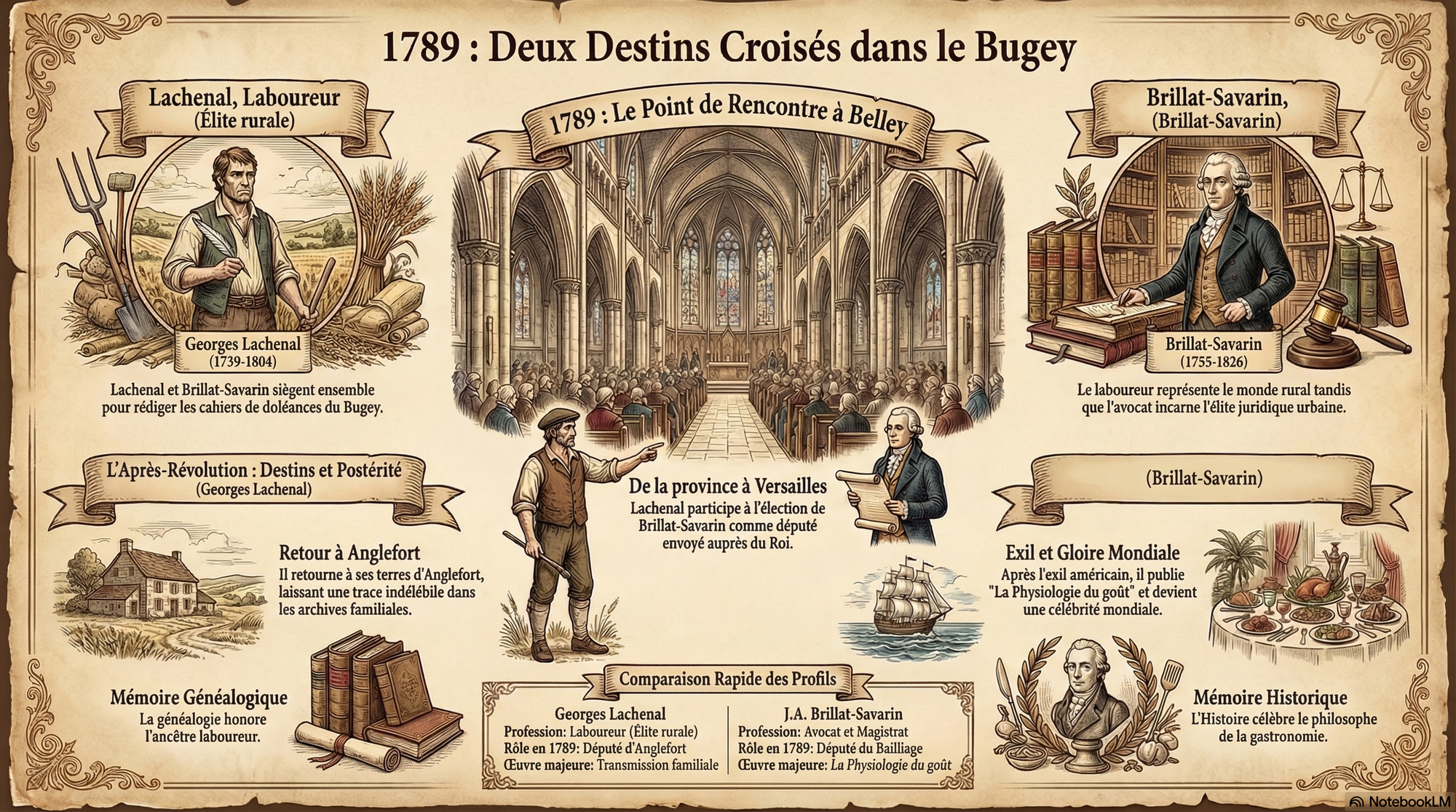 Mon aïeul Georges Lachenal, lui, était mort plus tôt, en 1804. Il n’a laissé ni livre célèbre ni aphorismes brillants. Pourtant son nom figure dans les archives de 1789. Pendant quelques jours, dans l’église des Cordeliers de Belley, il a participé à ce moment fondateur où les représentants du peuple ont commencé à prendre la parole. L’histoire a retenu le nom de Brillat-Savarin. La généalogie se souvient de Georges Lachenal. Mais dans cette nef de pierre, sous la charpente médiévale, ils furent tous deux les témoins d’un même instant : celui où un vieux royaume commençait à basculer.